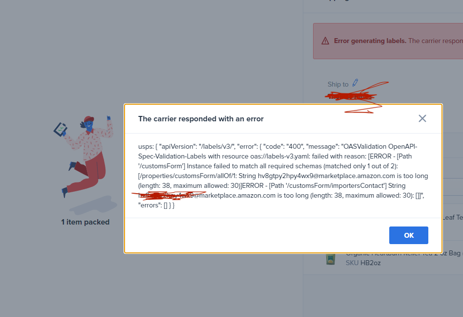 The root problem is that Amazon masks customer emails for privacy by generating random UUID-style addresses. Occasionally, these end up longer than the USPS API’s email field limit (30 characters), and the request fails with an error like this: